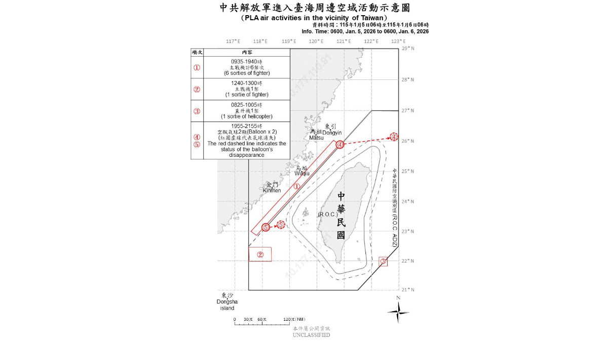 國防部發布台海空域動態圖,自昨(1/5)日上午6時至今(1/6)日上午6時止,共偵獲8架次中共軍機,7艘次中共軍艦,持續在台海周邊活動,並分別在基隆與屏東外海上空偵獲中共空飄氣球。國軍運用任務機、艦及岸置飛彈系統嚴密監控與應處。