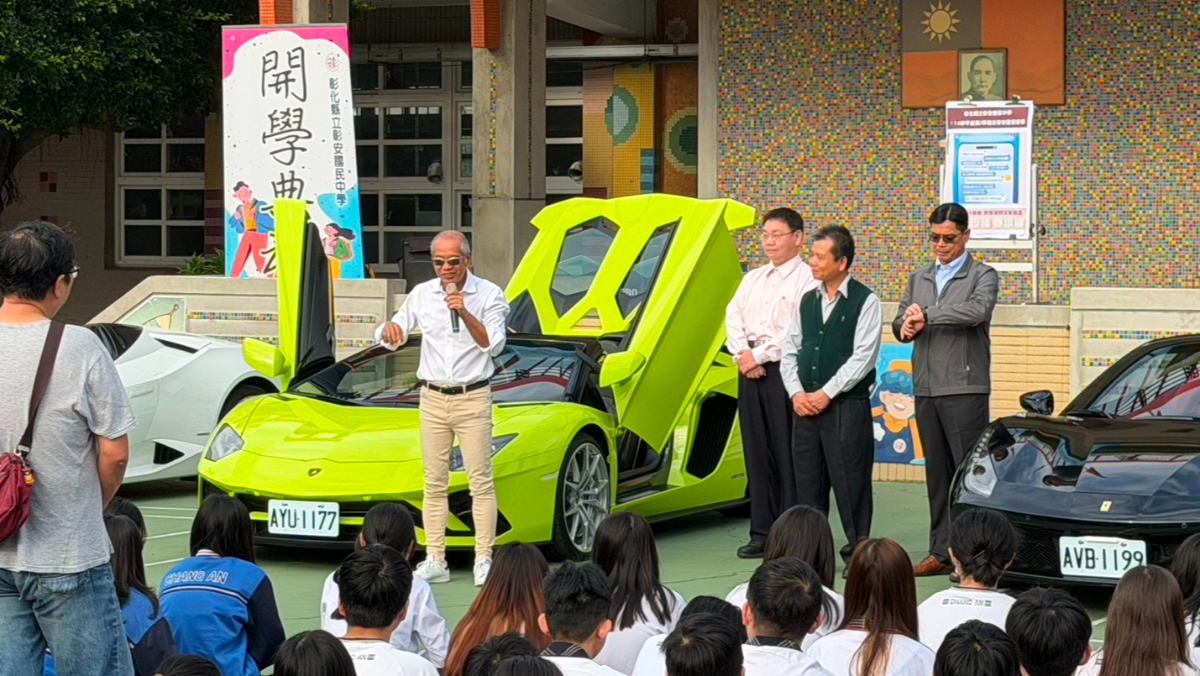 彰化市彰安國中今(24日)舉行一場相當特別的開學典禮,校方邀請傑出校友、全拓工業董事長吳崇讓開5輛總價上億的大牛、小牛、法拉利488、保時捷911 turbo S等超跑及URUS休旅車現身,轟隆引擎聲成功攫取全場注意力,吳崇讓也藉著「廁所哲學」勉勵學弟妹要自律、注重細節獲得成就,共創熱血人生。