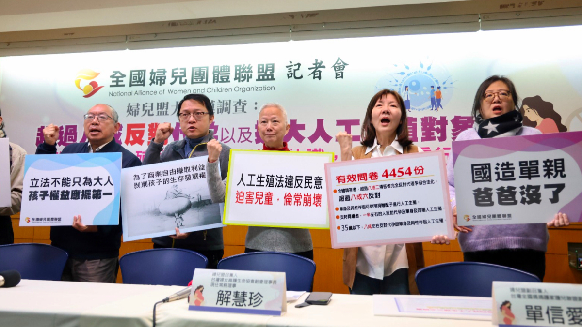 行政院通過《人工生殖法》修正草案,新增納入單身女性及女女同性伴侶。全國婦兒盟團體聯盟今(1/7)日公布最新民調指出,超過8成民眾反對代孕合法化,近9成反對擴大單身女性及女女同性伴侶適用人工生殖,代表政府宣稱「已有社會共識」,在民意結構上完全無法成立,呼籲退回草案、重啟討論。
