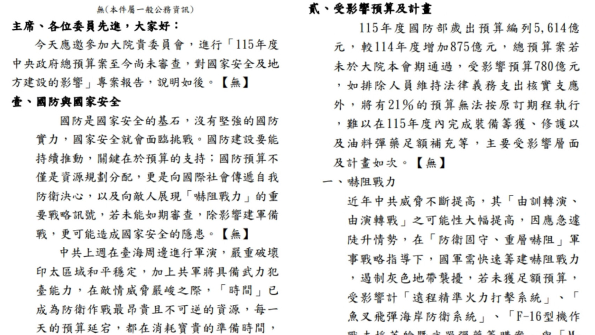 國防部近期施行「機密資訊精準標示精進作法」,但公開民眾的文件卻逐段都標示[無]、顯示沒有機密等級,遭批評「擾民」,國防部今天(1/09)晚間宣布,國防部今(9)日表示,經研討後,對於經檢視確認,內容不涉及「國家機密」或「一般公務機密」,且經權責長官同意,提供不特定多數人可得知悉的資訊,將改為於文件頁首標示【本件屬公開資訊】,而無須逐段標示【無】。