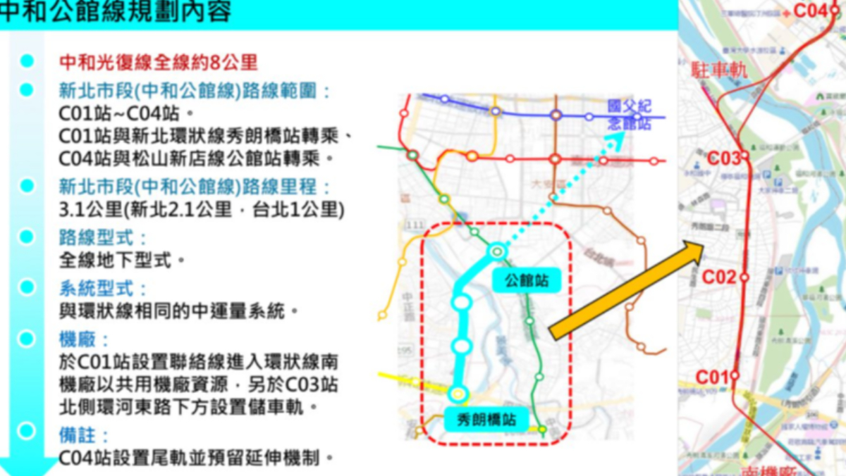 新北市長侯友宜今天(1/6)上午,前往新北環狀線秀朗橋站視察,談到「中和公館線」,他表示去年5月新北已啟動可行性研究,預計今年年中完成報告提報中央審議。他強調,這是他任內最後一年,有責任要把捷運中和到公館段送交通部審議。依照規劃,「中和公館線」從中和的秀朗橋站到公館站路線3.1公里、擬設4站,未來更可以直接通往國父紀念館站。