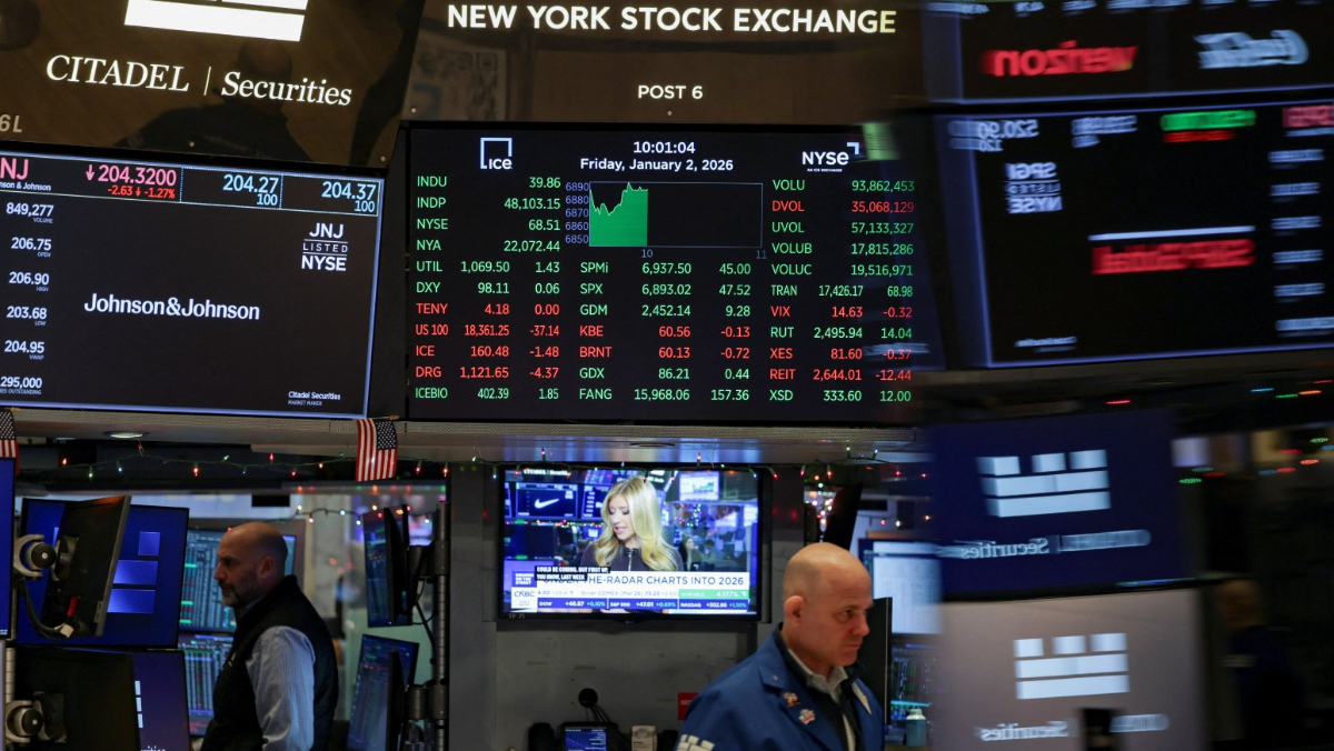 美國股市在2025年達成連續3年成長後,週五(1/2)為2026年開盤第一天,三大指數漲跌不一,其中道瓊工業指數收高,那斯達克指數微幅下跌。