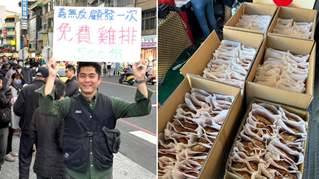 2024總統大選結果揭曉,由民進黨賴清德、蕭美琴勝出。網紅張譯Eddy(嘴哥)今傍晚在嘉義發放500份雞排,表示要慶祝新總統當選、慶祝阿北(柯文哲)雖敗猶榮,還以柯文哲的「義無反顧拼一次」口號作文章,笑稱要「義無反顧發一次」!