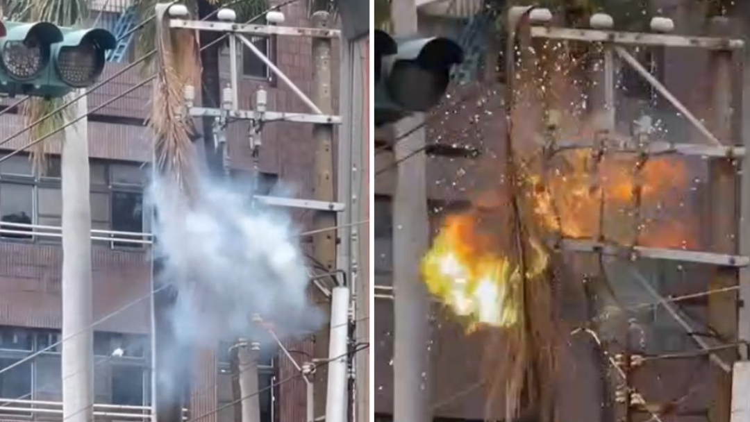 員林路邊的大王椰子樹葉落在高壓電線上,先是冒出白煙,接著爆出火光,發生轟轟聲響。翻攝自記者爆料網