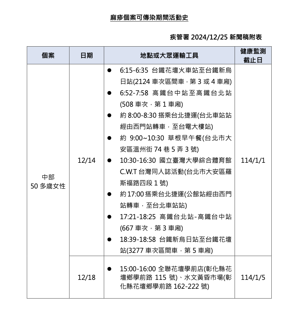 疾病管制署今(25)日上午公布國內新增7例麻疹確定病例,其中1名50多歲就醫接觸者之陪病家屬,經持續疫調,發現個案可傳染期間有彰化縣及臺北市之公共場所活動史,且曾搭乘大眾交通運輸工具。本案接觸者最晚監測至2025年1月5日。
