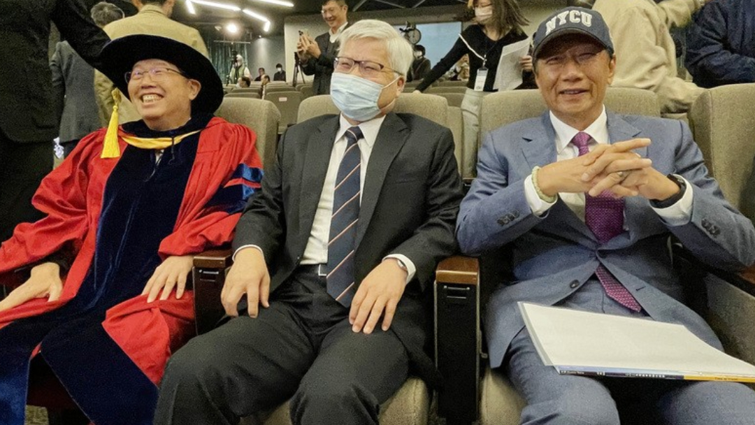 國立陽明交通大學8日頒授鴻海董事長劉揚偉(左)名譽博士學位,鴻海創辦人郭台銘(右)、台積電總裁魏哲家(中)出席祝賀,三人會前齊聚一堂。 中央社