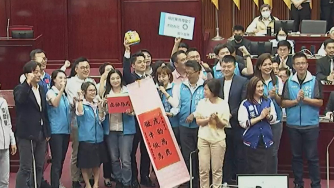 今天會議一開始,國民黨團書記長王欣儀就率領同黨議員上前為蔣萬安打氣,還送上能量飲料以及「虎勁為民,做牛做馬」題字;民進黨團則拿出字卡譏諷「當選靠阿公,市政不用功」、「無感市長,市政吊車尾」等,兩黨較勁意味濃厚。