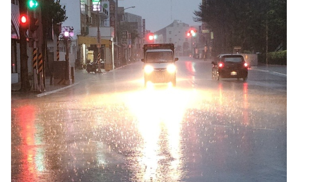 澎湖地區7日早上下起滂沱大雨,白天宛如黑夜,行車都要開燈。中央社