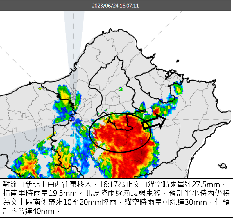 此外,氣象局並於16時15分發布「豪雨特報」,因應對流雲系發展旺盛,易有短延時強降雨,除了新北市山區有局部大雨或豪雨發生的機率之外,大雨特報則包含台北市、桃園市、新竹縣、苗栗縣、台中市、南投縣、雲林縣、嘉義縣及台南市,民眾應注意雷擊、強陣風及溪水暴漲。16:10為止新北市烏來區桶後站1小時雨量達86mm(10分鐘雨量18mm),其次為新店區屈尺站1小時雨量47mm。