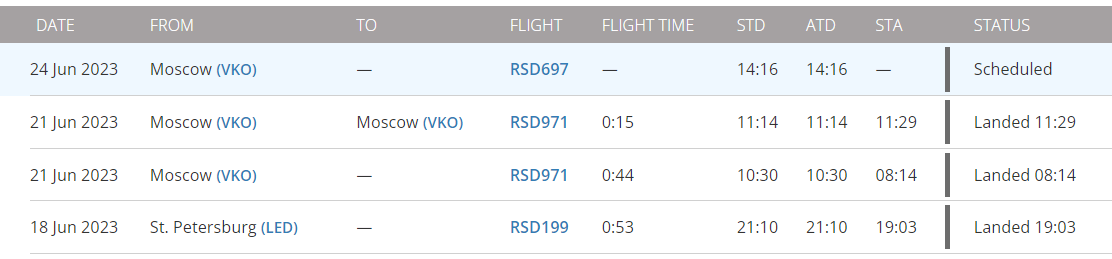 俄國傭兵集團華格納進逼首都莫斯科,驚傳俄國總統普丁已準備專機出逃?知名飛機追蹤網站flightradar24資料顯示,一架隸屬「俄羅斯總統機隊」(Rossiya Special Flight Squadron),呼號RSD697的專機在當地時間24日下午2點16分自莫斯科起飛。