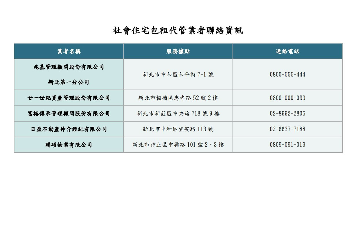 新北市租金補貼及包租代管,社會住宅包租代管業者聯絡資訊。新北城鄉局提供