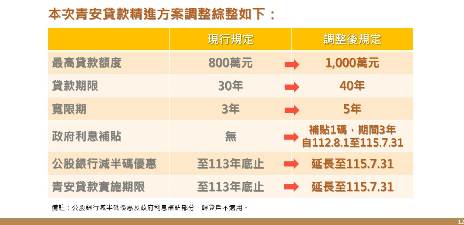 為減輕民眾購屋負擔並紓解資金壓力,行政院會今(7/13)通過「青年安心成家購屋優惠貸款精進方案」,內容包含最高貸款額度自現行800萬元提高至1,000萬元、貸款年限自30年延長至40年,寬限期自3年延長至5年;另貸款利率補貼1.5碼,現行公股銀行已自行吸收減收半碼,再由政府補貼一碼。財政部國庫署署長蕭家旗表示,目的就是為落實居住正義。