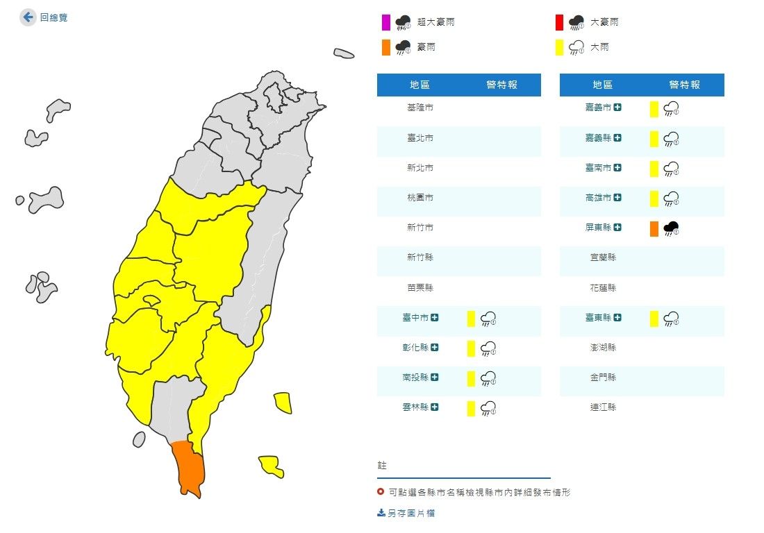 氣象局對台中市、彰化縣、南投縣、雲林縣、嘉義市、嘉義縣、台南市、高雄市及台東縣發布大雨特報,另對屏東縣發布豪雨特報。