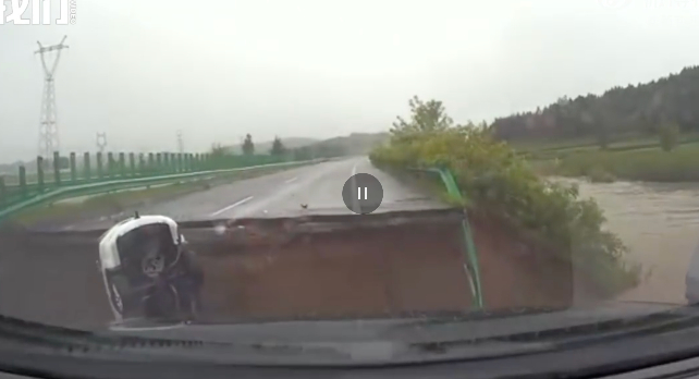 中國北方豪雨災情頻傳。根據新華社,黑龍江省哈牡高速公路因為豪雨坍塌,有車輛經過直接栽入塌陷的橋面凹洞,所幸後方車輛協助,駕駛幸運獲救。