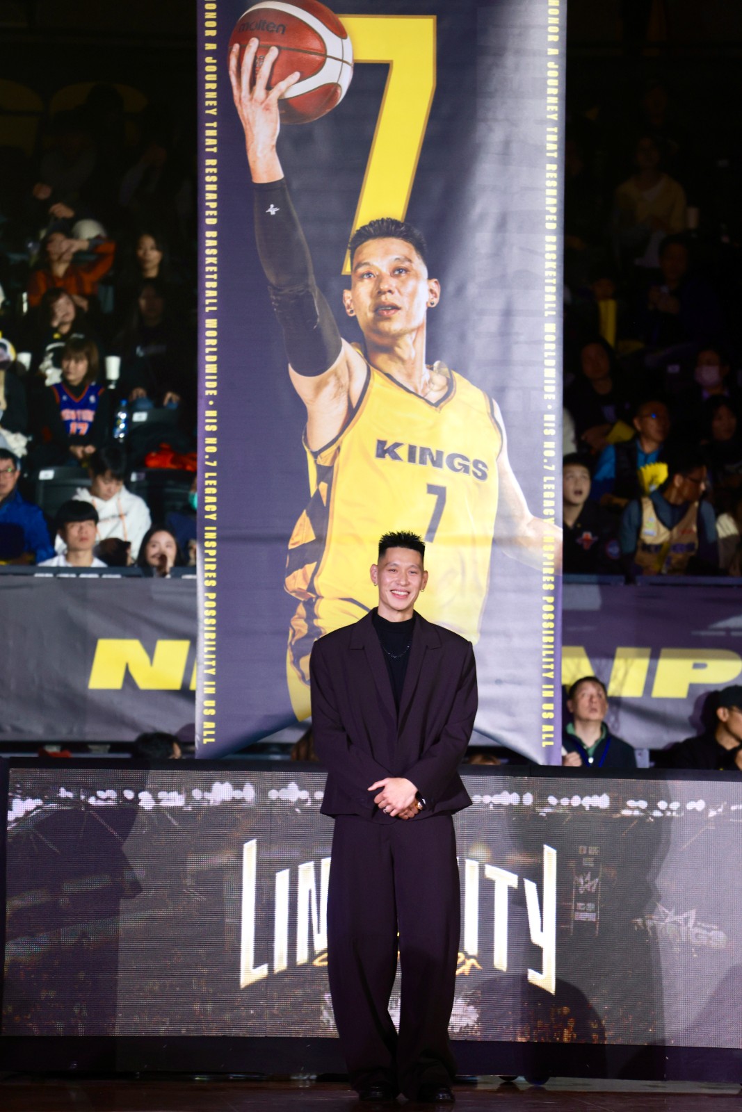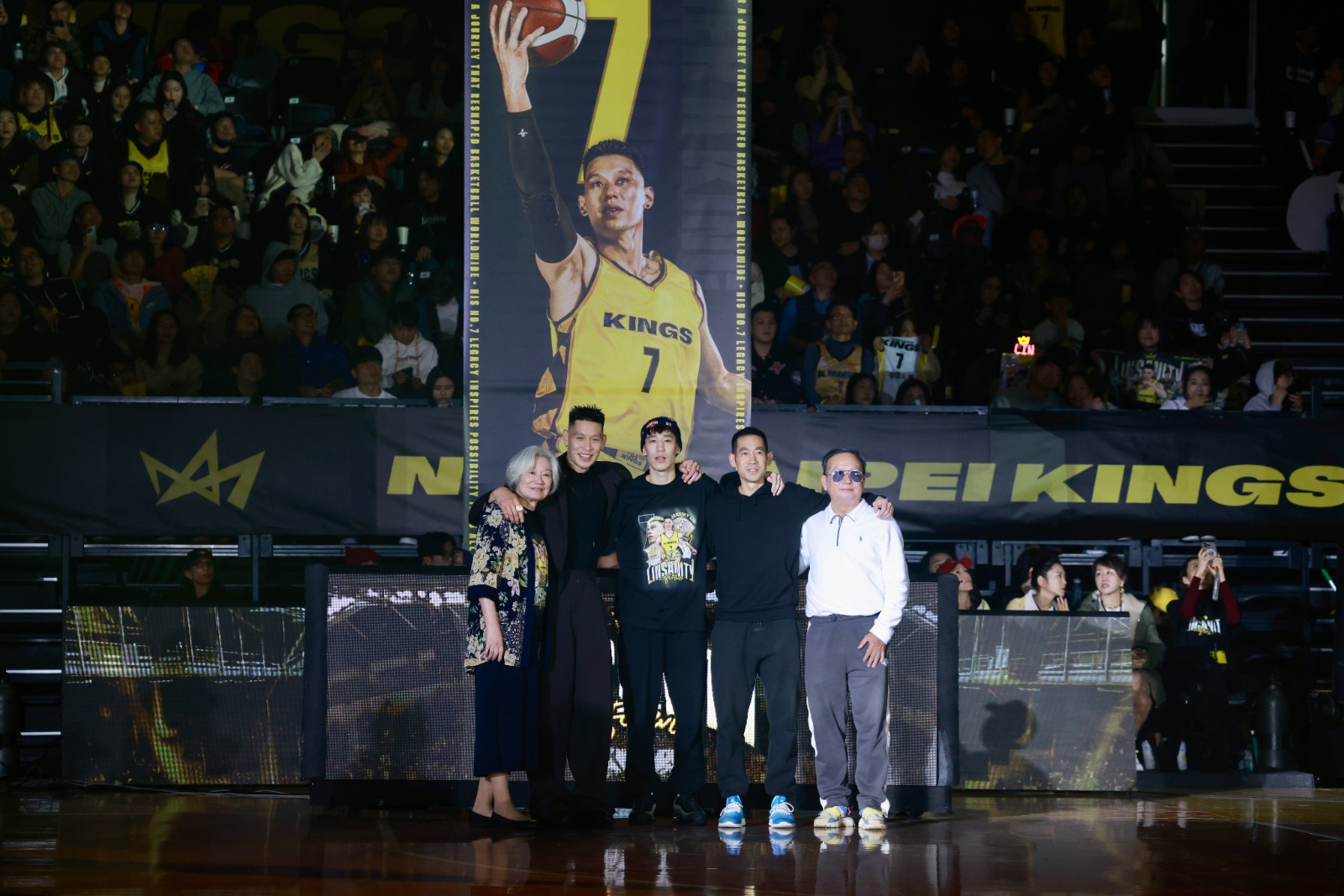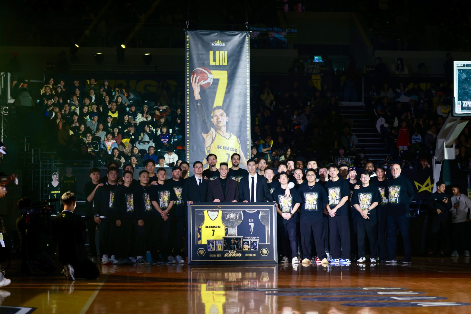 台灣職業籃球大聯盟(TPBL)新北國王隊今晚在主場新莊體育館舉辦「Linsanity Forever」林書豪球衣退休儀式,場邊掛滿林書豪各時期所穿的7號球衣。現場播放林書豪生涯 Highlight 精華影片,林書豪與家人一同出場;林書豪的藝人好友周杰倫也都到場觀禮。