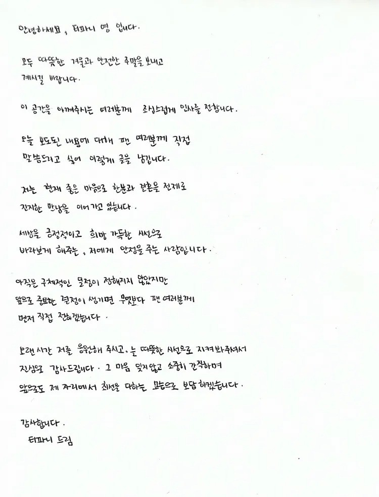 Tiffany曬出親筆信認愛。翻攝tiffanyyoungofficial IG