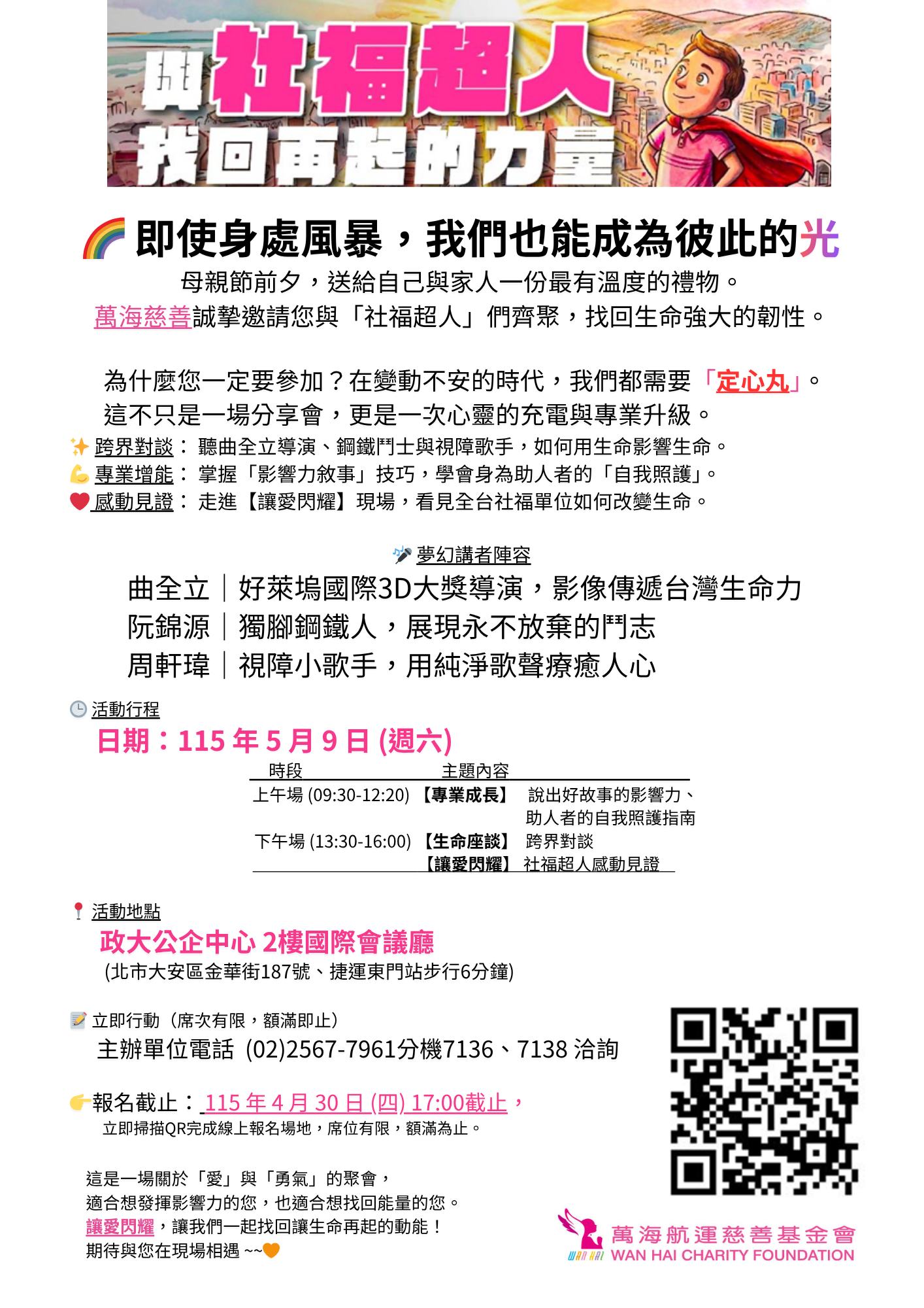 萬海慈善指出,本次活動全程免費,歡迎社福工作者、社工科系學生,以及所有關心社會公益、想要傳遞助人能量的民眾參與。即日起開放報名至4月30日下午5時止,名額有限,額滿為止,活動詳情請上萬海慈善官網查詢:https://wanhai-charity.org.tw/2026news03/。