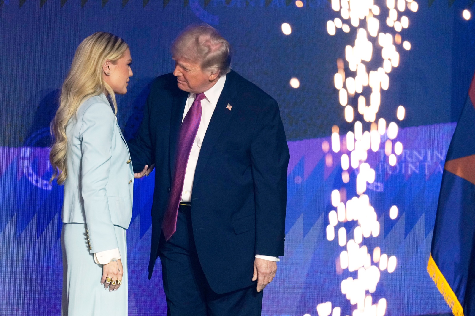 2026年4月17日,美國保守派組織「美國轉捩點」執行長艾瑞卡(左),主持該組織在費城的活動,總統川普與會;她是創辦人柯克的遺孀。美聯社