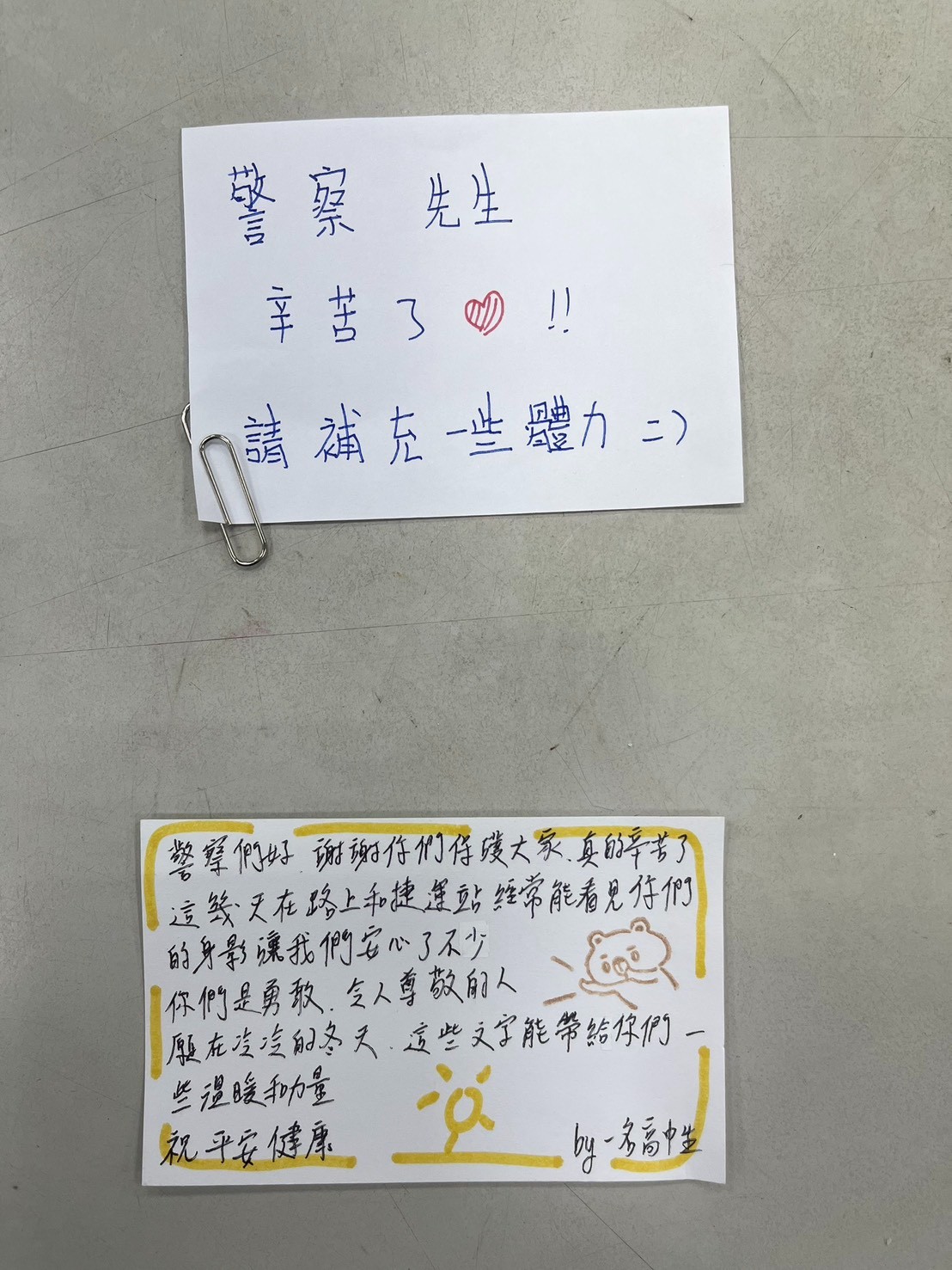 中正第一分局表示,警察工作繁重,有時又夾帶了風險,全年無休守護市民安全,而民眾的一句理解、一份支持,往往就是撐過辛勞的重要力量。