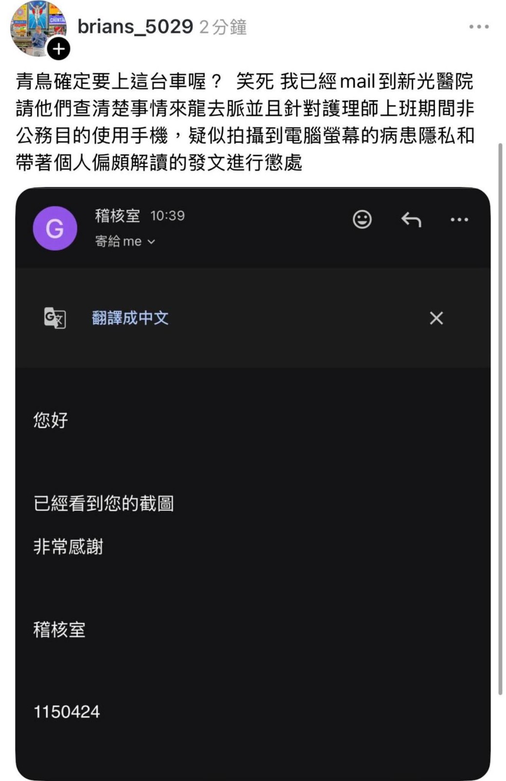 有網友在Threads上發文稱已向院方檢舉貼文的護理師,翻攝杜承哲臉書