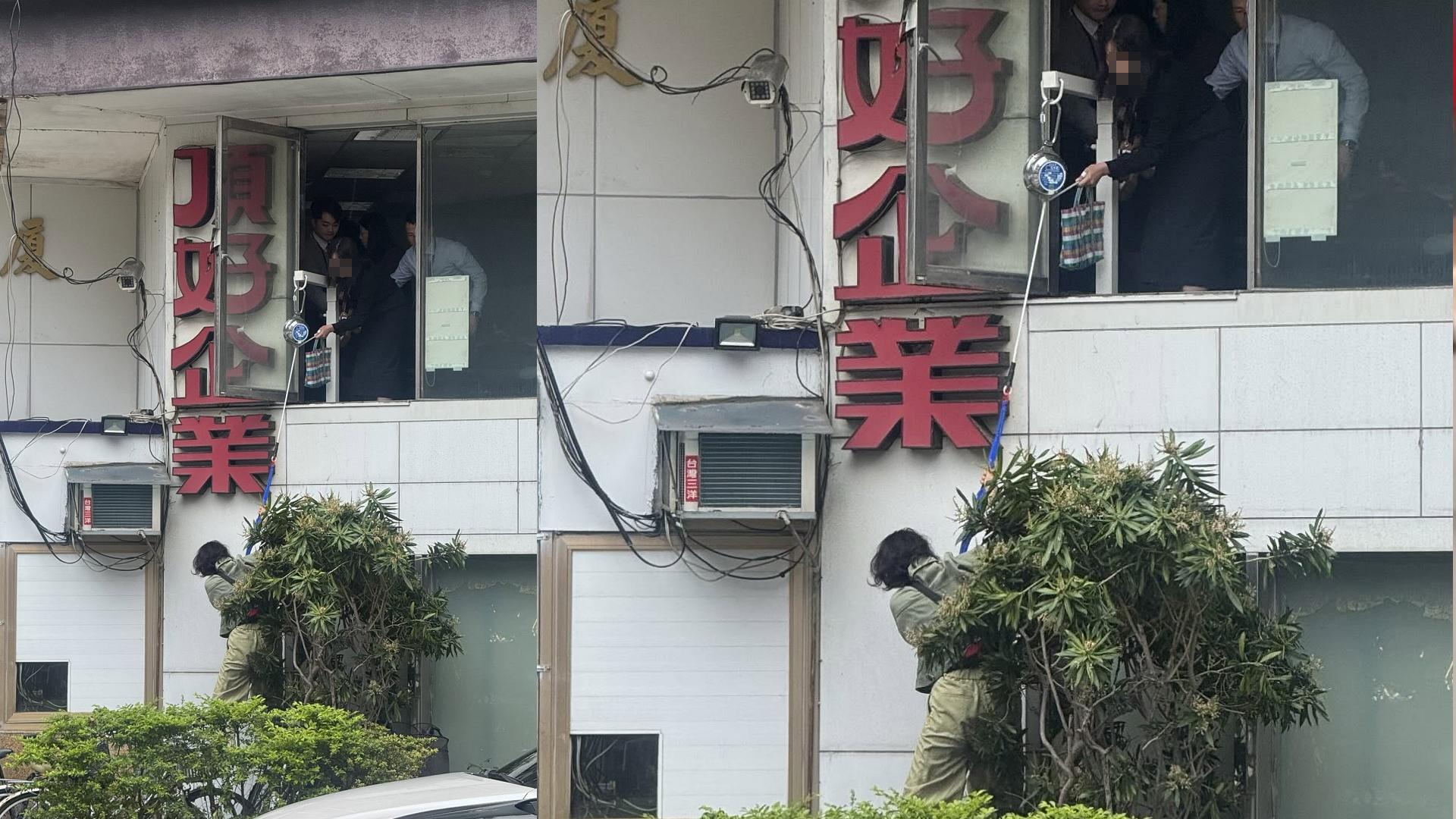 網友表示,頂好廣場聽到路人說警察有配槍,然後便目擊有人垂降,「是怎樣...要嚇死」。照片顯示,大樓內的上班族打開窗戶,往下方垂降,驚險萬分。另有網友拍到,銀行裡裡外外都是警察,各個配槍,網友表示,「居然發生這一幕,搶劫」